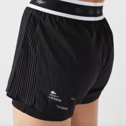 Fashion meets technical crafting in the form of this feminine pair of Lacoste Sport shorts. Crafted in lightweight recycled nylon, they are equipped with built-in compression shorties in a contrasting fabric. A striped elasticised waist and side pleats ensure a great freedom of movement. Truly essential for your next match, with well-designed accents.